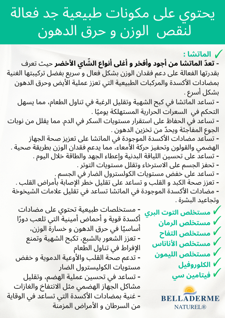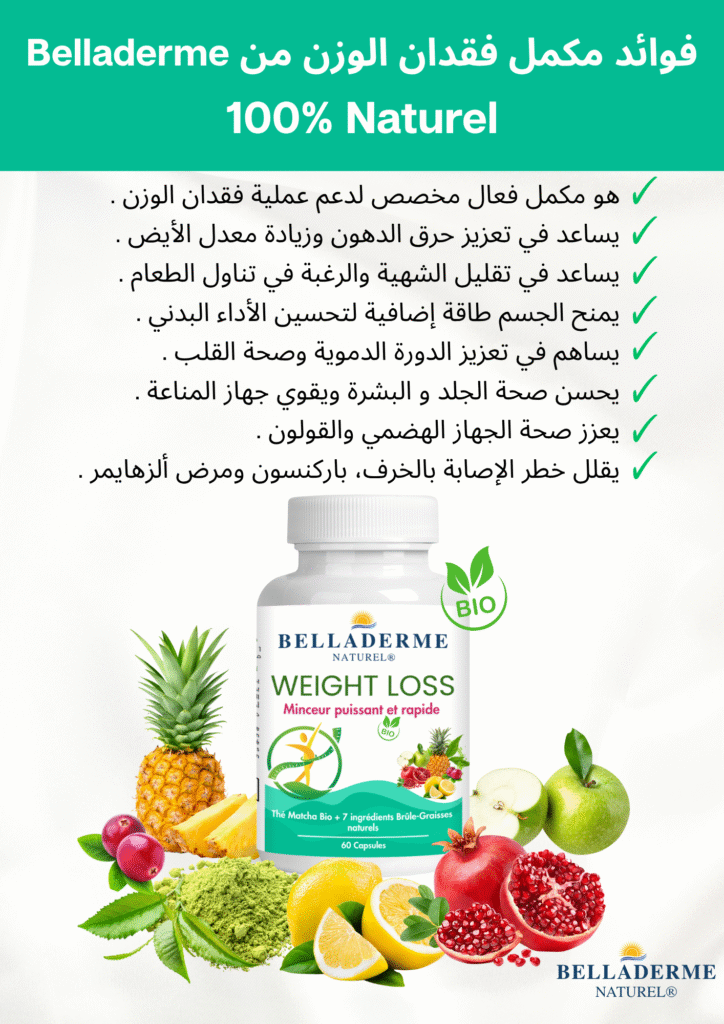 هو مكمل فعال لنقص الوزن و حرق الدهون، مصمم خصيصا لدعم إدارة الوزن وتعزيز عملية الأيض الصحي. تركيبة المكمل تعمل على تعزيز عملية حرق الدهون بشكل فعال و سريع، تقليل الشهية، وزيادة مستويات الطاقة. يدعم حرق الدهون وإدارة الوزن بشكل فعال، يساعد في تقليل الشهية والرغبة في تناول الطعام، يساعد في الحفاظ على استقرار مستويات السكر في الدم مما يقلل من نوبات الجوع المفاجئة ويحدّ من تخزين الدهون، يساعد على تعزيز صحة الجهاز الهضمي والقولون وتحفيز حركة الأمعاء، مما يدعم فقدان الوزن بطريقة صحية.